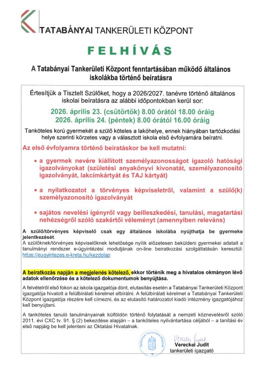 Az alábbiakban közzétesszük a 2024/2025. tanévre vonatkozó általános iskolai beiratkozást támogató, az előzetes jelentkezéshez is kapcsolódó szülői tájékoztató segédletet.
